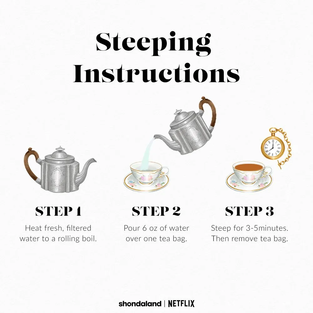 Steeping black tea is easy. Simply heat fresh, filtered water to a rolling boil. Then pour 6 oz water over tea and steep for 3-5 minutes.