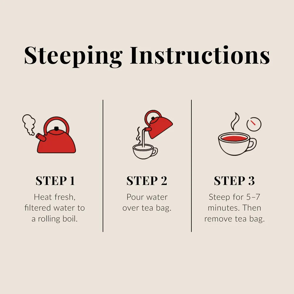 Steeping herbal tea is easy. Simply heat fresh, filtered water to a rolling boil. Then pour 6 oz of water over the tea bag and steep for 5-7 minutes. Serve hot or let cool and pour over ice.