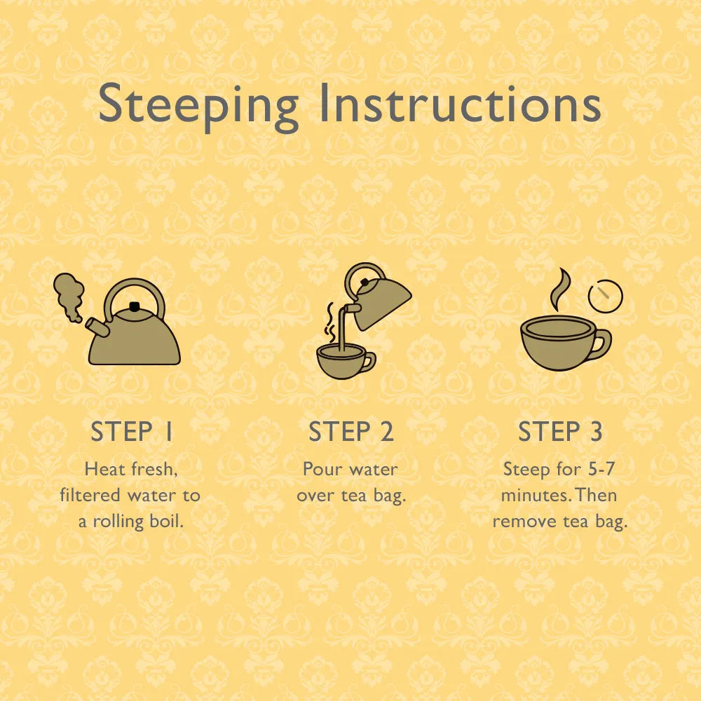 Steeping black tea is easy. Simply heat fresh, filtered water to a rolling boil. Then pour 6 oz water over tea and steep for 3-5 minutes.