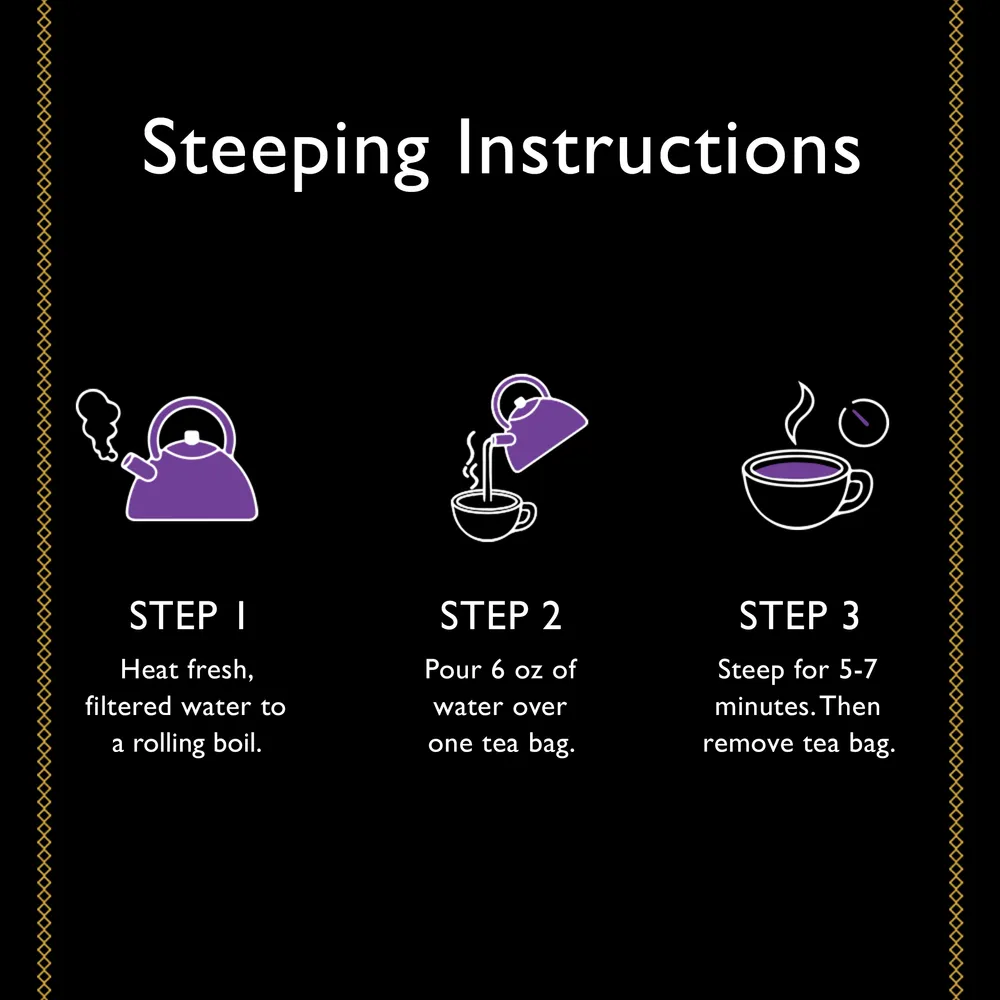 Steeping herbal tea is easy. Simply heat fresh, filtered water to a rolling boil. Then pour 6 oz of water over the tea bag and steep for 5-7 minutes. Serve hot or let cool and pour over ice.