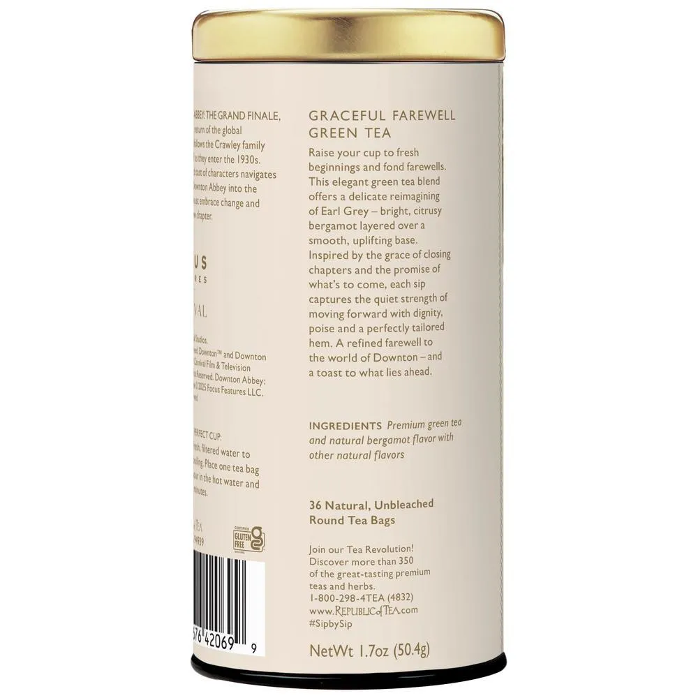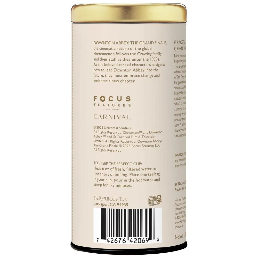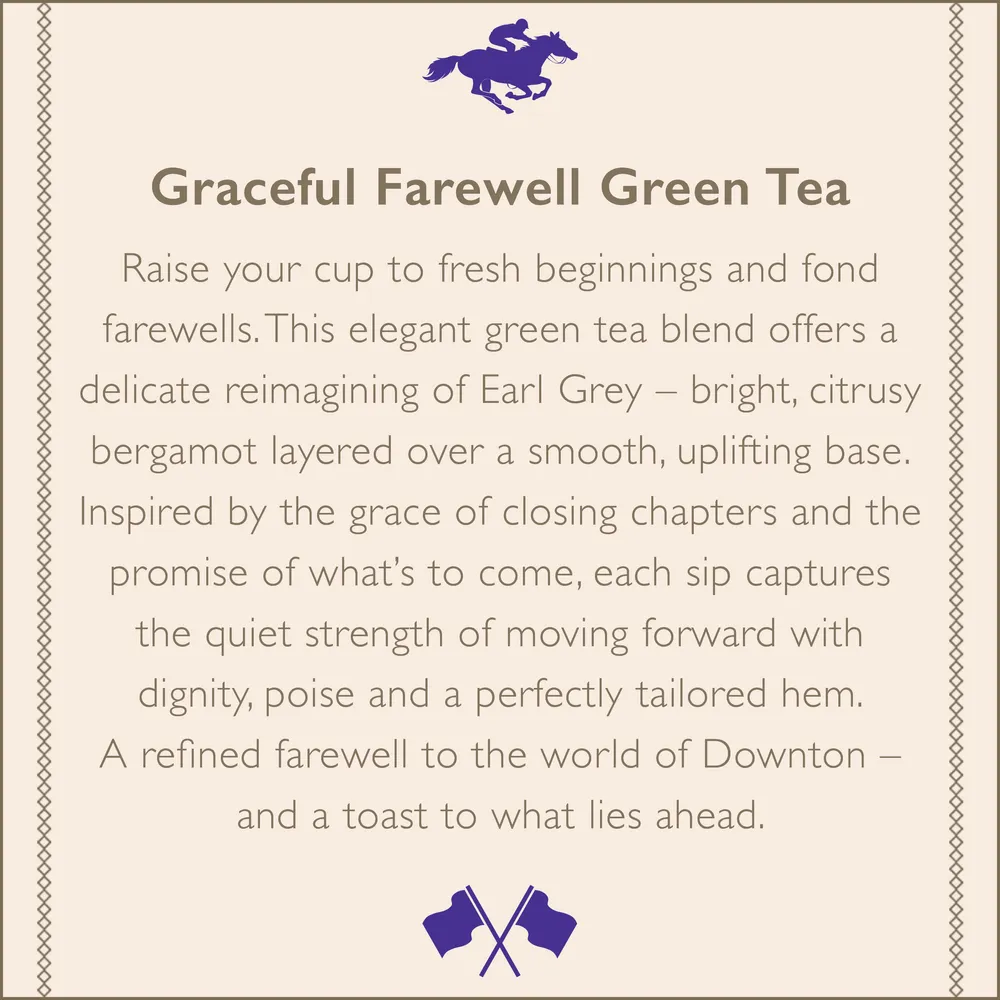 Raise your cup to fresh beginnings and fond farewells. This elegant green tea blend offers a delicate reimagining of Earl Grey — bright, citrusy bergamot layered over a smooth, uplifting base. Inspired by the grace of closing chapters and the promise of what's to come, each sip captures the quiet strength of moving forward with dignity, poise and a perfectly tailored hem. A refined farewell to the world of Downton — and a toast to what lies ahead.