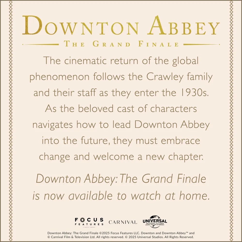 Downton Abbey: The Grand Finale, the cinematic return of the global phenomenon follows the Crawley family and their staff as they enter the 1930s. As the beloved cast of characters navigates how to lead Downton Abbey into the future, they must embrace change and welcome a new chapter. Downton Abbey: The Grand Finale is now available to watch at home.