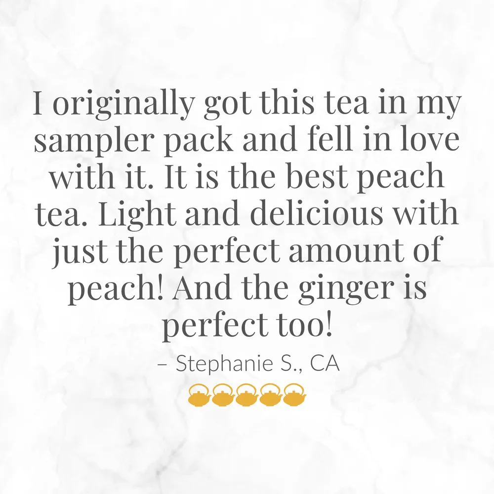 This tea offers the lush natural flavors of a fancy peach seasoned with the tingle of spicy ginger in a base of 100% White Tea. For thousands of years, the peach has been China's darling of longevity. Nice over ice.