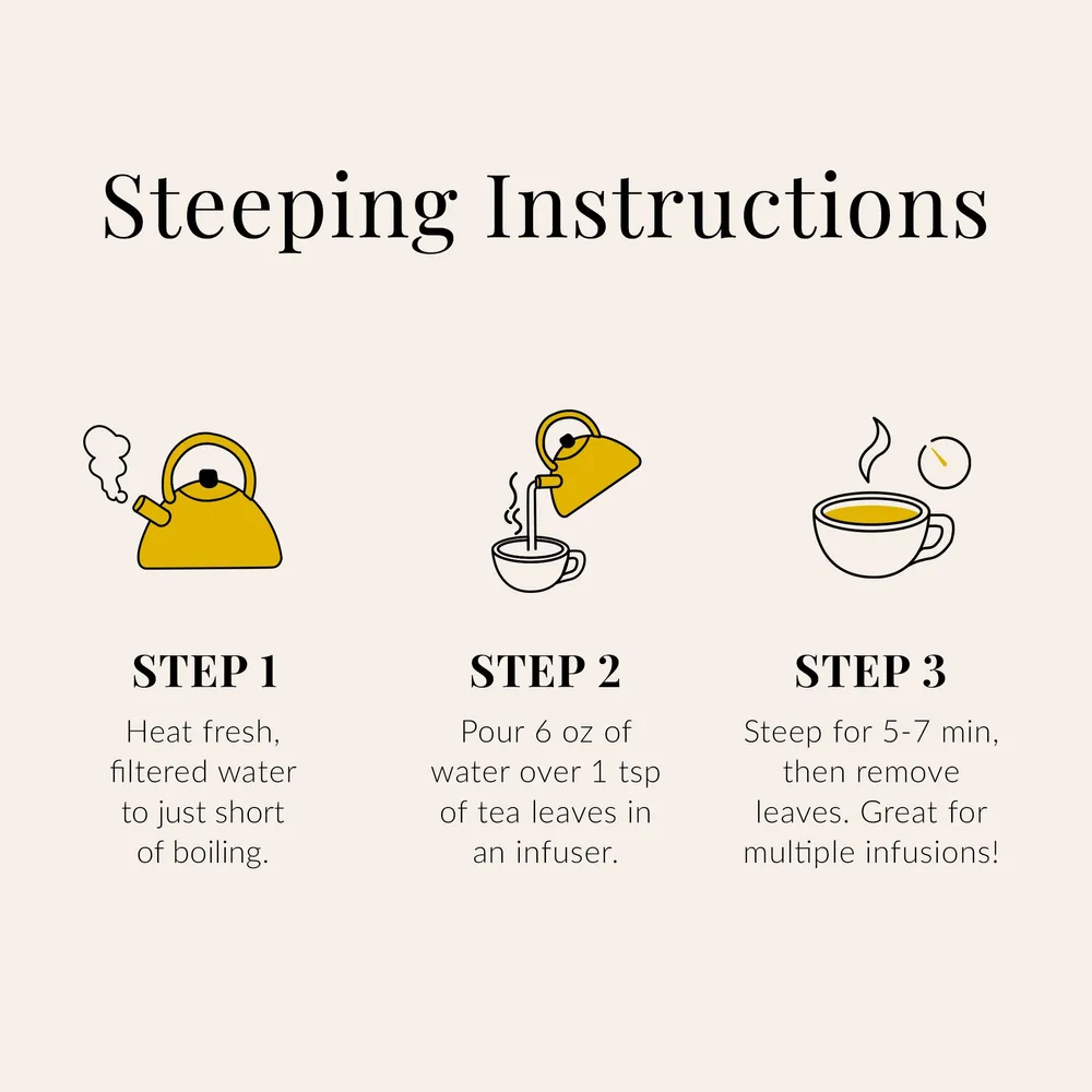 Steeping Oolong tea is easy. Simply heat fresh, filtered water to just short of boiling. Pour 6 oz of water over 1 tsp of tea leaves in an infuser. Steep for 5-7 minutes, then remove leaves. Great for multiple infusions!