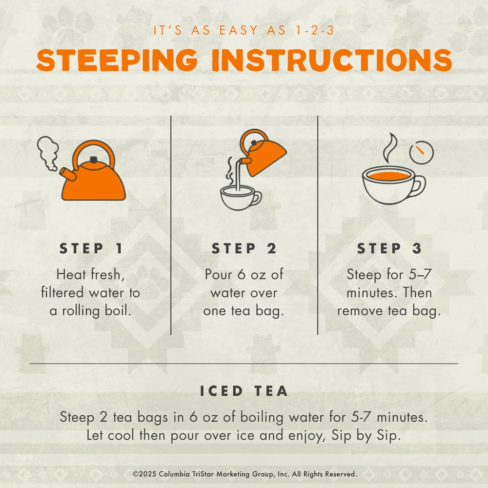 Steeping herbal tea is easy. Simply heat fresh, filtered water to a rolling boil. Then pour 6 oz of water over the tea bag and steep for 5-7 minutes. Serve hot or let cool and pour over ice.