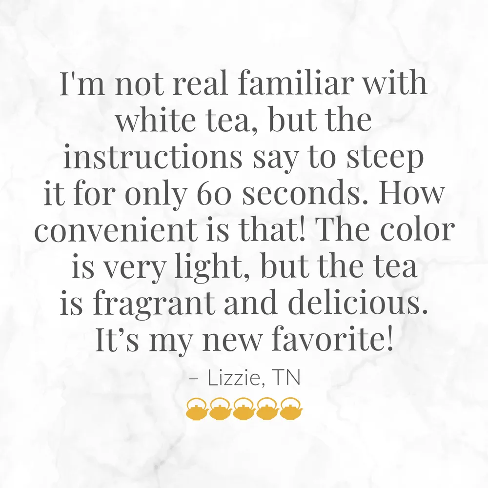 Steeping white tea is easy. Simply heat fresh, filtered water to just short of boiling. Then pour 6 oz water per serving over tea and steep for 30-60 seconds (if using tea bags) or 2-3 minutes (if using full-leaf.)