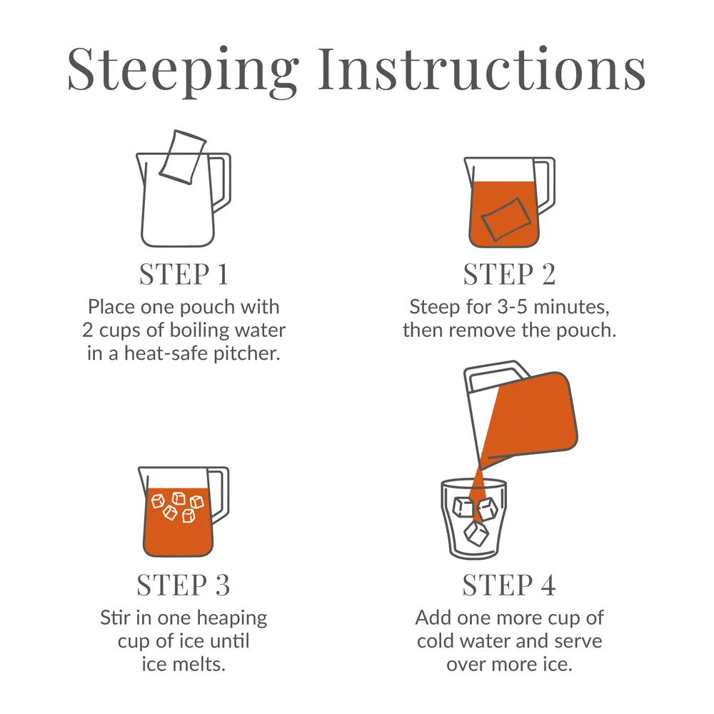 Place one pouch with 2 cups of filtered, boiling water in a heat-safe pitcher. Steep for 3-5 minutes. Remove pouch then stir in one heaping cup of ice cubes until ice melts. Add one more cup of cold water and serve over more ice.