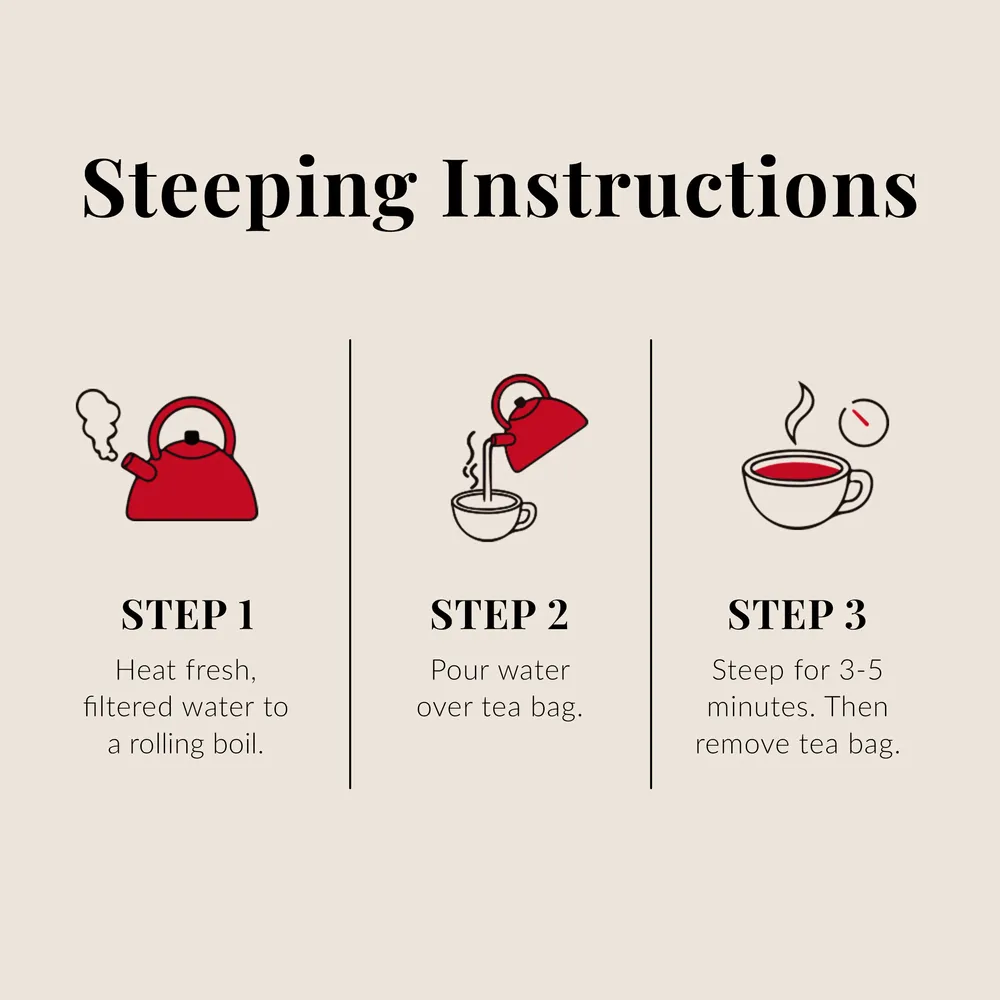 Steeping black tea is easy. Simply heat fresh, filtered water to a rolling boil. Then pour 6 oz water over tea and steep for 3-5 minutes.