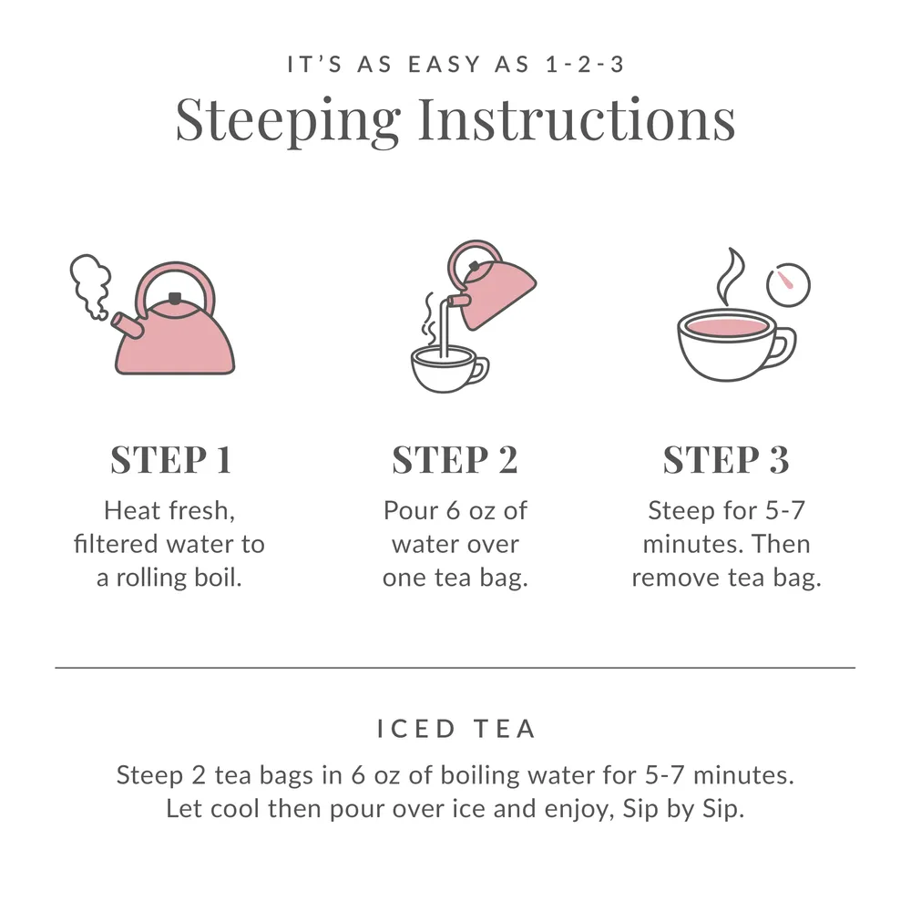 Heat 6 oz of fresh, filtered water to boiling. Place one tea bag in your cup, pour in the hot water and steep for 5-7 minutes.